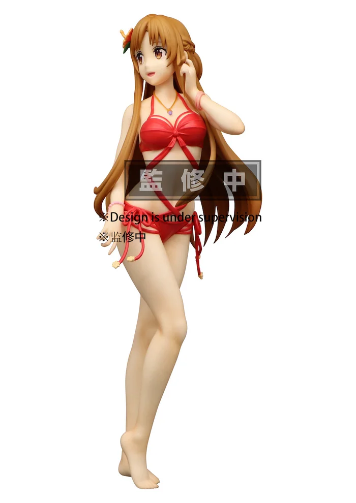 from Furyu’s SSS Figure line comes Asuna from Sword Art Online: Alicization posing in a swimsuit! The non-scale figure captures Asuna-chan in a red bikini with a warm smile on her face as she twirls a strand of hair between her fingers. A hibiscus flower decorates her hair while jewelry adorns her body including a necklace and bracelets, one of which has a starfish charm. Her snug bikini has been carefully sculpted and features ties with flowers on the ends. The braids of her hair are also on point! Let her bring some warm beach vibes to your collection!